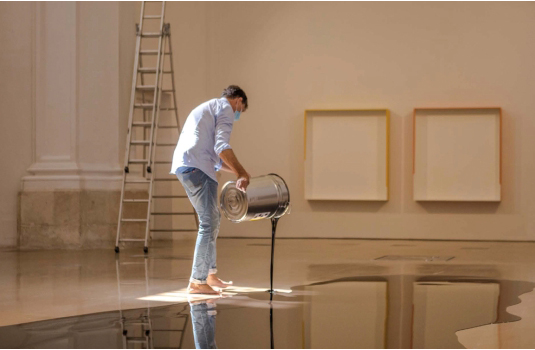 Asimismo, el montaje aprovecha la zona de clausura de la antigua iglesia conventual para recoger una serie de obras de menor tamaño y más íntimas que invitan al recogimiento y la reflexión. En este espacio también hay otro vertido de Splitt, de menor tamaño.