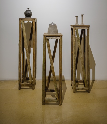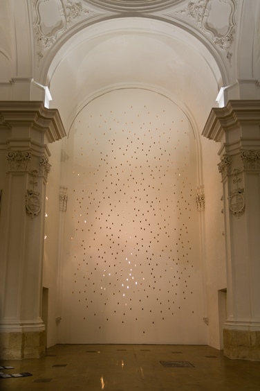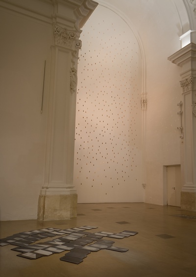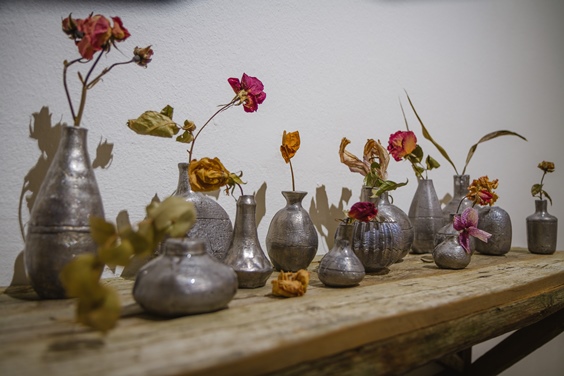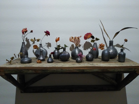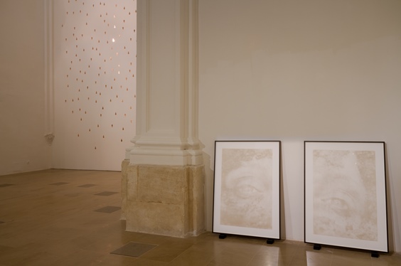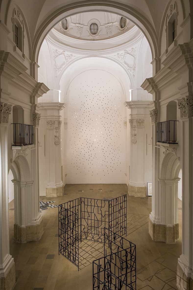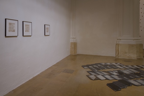 En Verónicas, el visitante encontrará construcciones geométricas que, bajo la apariencia de rejas o celosías, albergan una escritura que se traza en el aire. Alfabetos de plomo y ceniza que se tamizan con el suelo de la sala a modo de un texto tejido. Metales tóxicos como el plomo que albergan flores con historias caducas de amor y deseo. Cenizas en la mirada y los rostros de un teorema aún por resolver. Escrituras en blanco que dialogan con grafemas en oro, azul y rosa. Y finalmente, el cobre, metal duradero que conduce y cura, como las lágrimas.